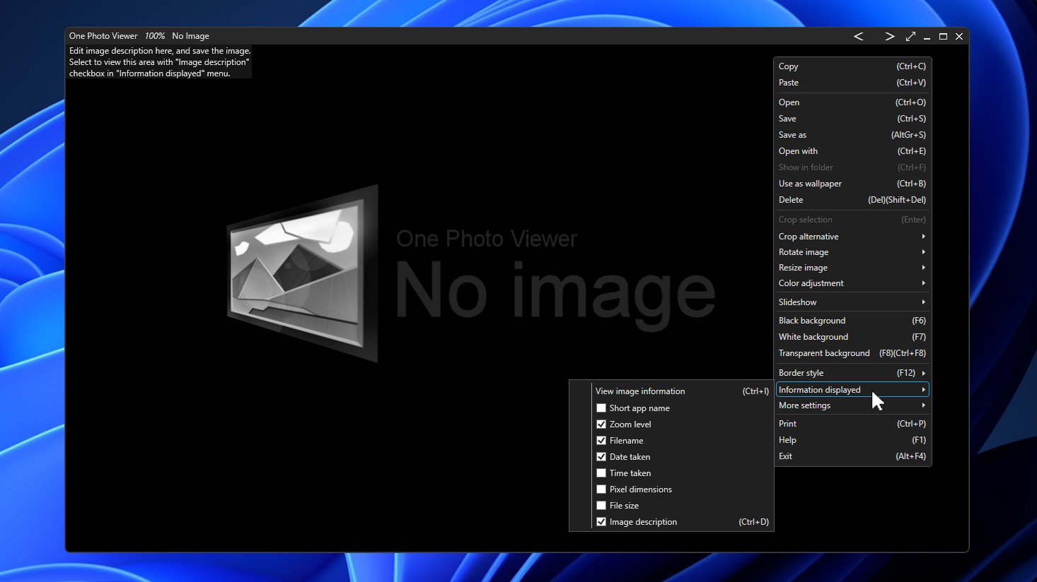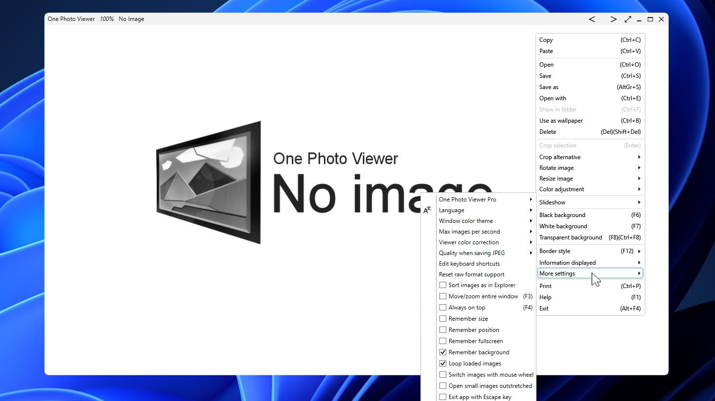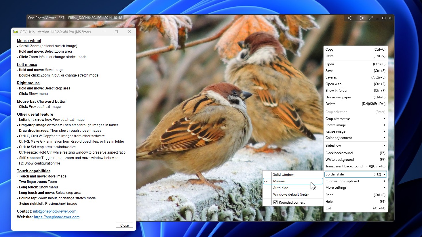 Available for free with no ads, or get Pro version to support development and get two extra optional features, otherwise thay have same functionality. One Photo Viewer has many customization options and features such as slideshow, color adjustment, crop, resize, rotate, copy/paste clipboard, and more. All accessible by right click menu or keyboard shortcuts. It is also touchscreen compatible.